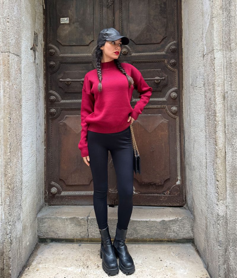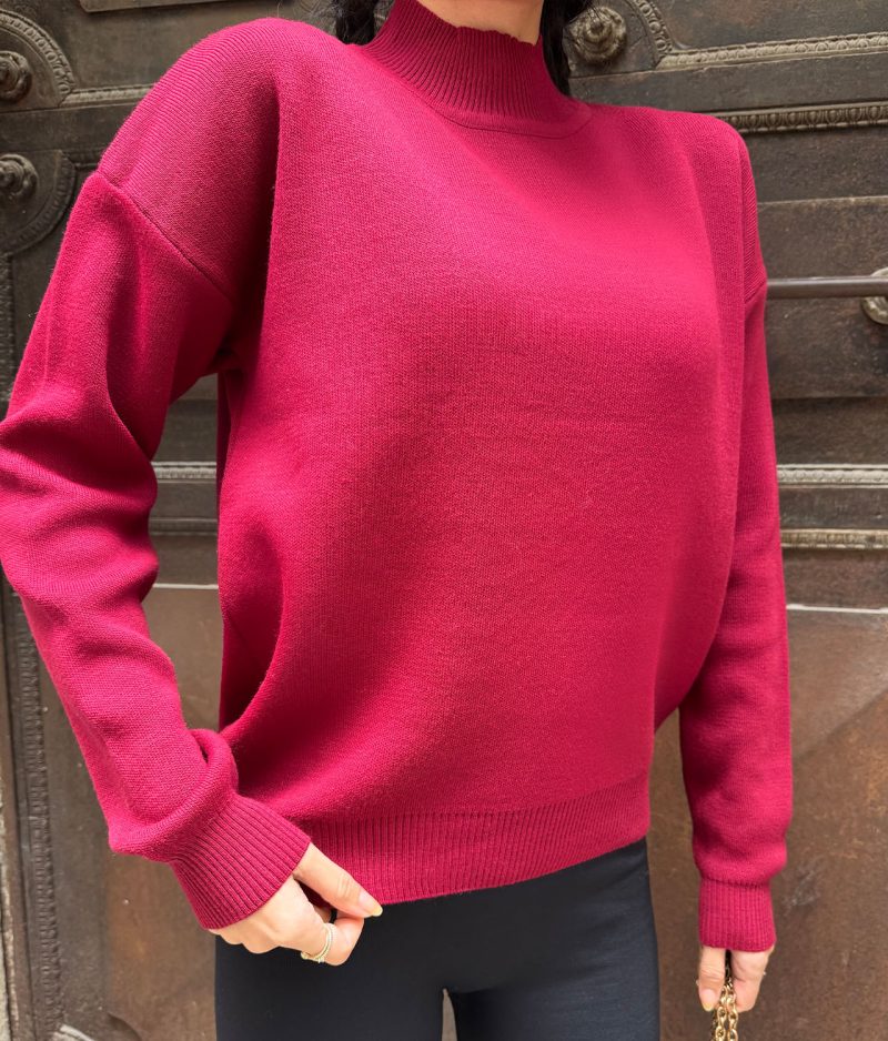 This sweater balances simplicity and style with its clean design. The mock neck adds a refined touch, while ribbed cuffs and hem enhance durability. Moreover, its relaxed fit offers ease of movement, making it suitable for casual and semi-formal looks. In addition, the deep burgundy color adds a bold yet classic appeal to any wardrobe.