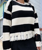 5859-Striped Long Sleeve Crewneck Ripped Detail Knit Sweater