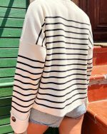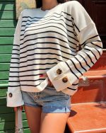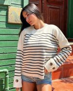 6504-Crewneck Oversize Striped with Cufflinks Knit Sweater