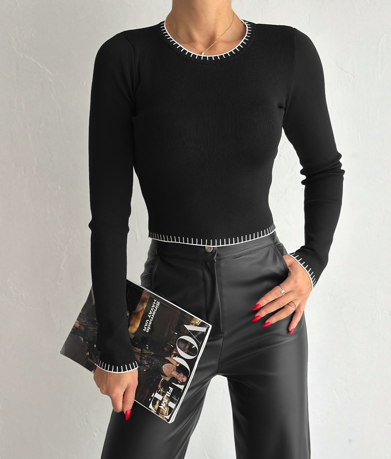 Pair this Contrast Stitch Knit Top with jeans for a laid-back weekend look, or wear it with tailored trousers for a chic office outfit. Additionally, it works well as a layering piece under jackets and coats. Its lightweight design ensures comfort, while the contrast details add a premium touch. Furthermore, the versatile black color makes it easy to match with different bottoms and accessories.
