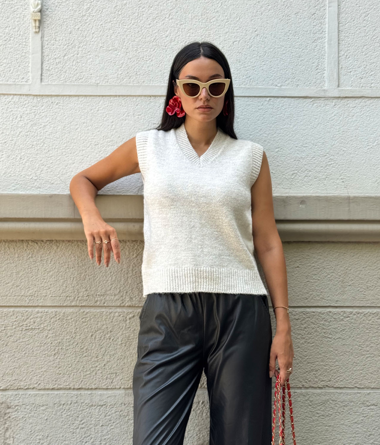 Sleeveless V-Neck Knit Vest is a simple yet stylish piece designed for easy layering and all-season wear. Made from soft knit fabric, it features a sleeveless cut and a flattering V-neckline. The off-white color adds a clean and classic look, making it easy to style for both casual and semi-formal outfits. Moreover, its lightweight design ensures comfort and versatility throughout the day.